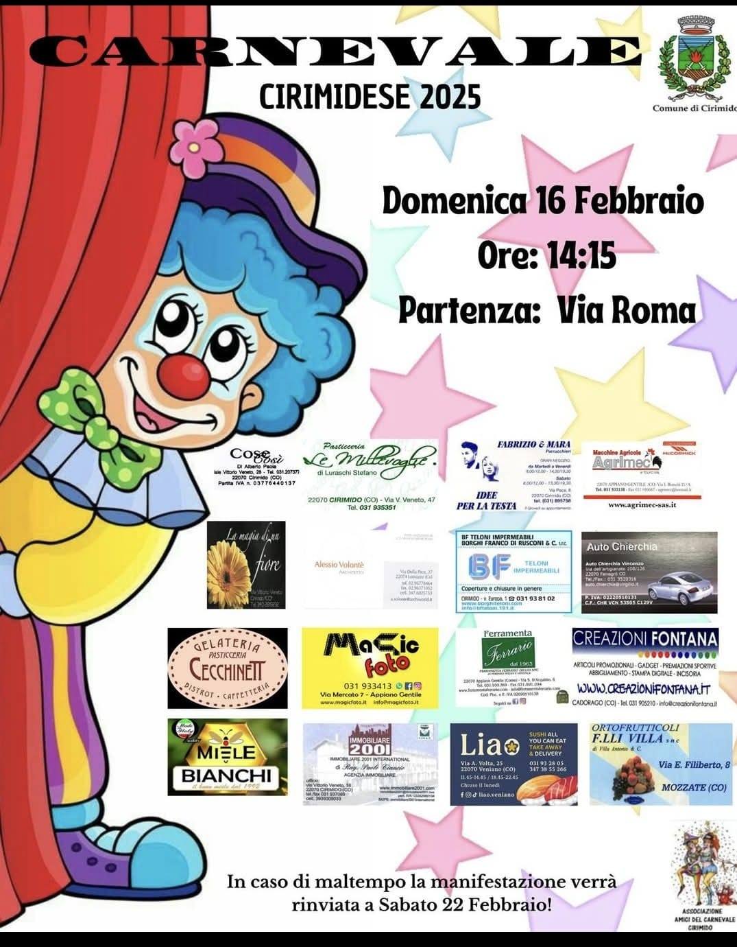 L’associazione Amici del Canevale Cirimido, oltre ad occuparsi del carnevale, svolge molte altre attività, tra cui la famosa “Cirimido corre in maschera”, il “Verde Pulito”, le numerose collaborazioni con la biblioteca comunale di Cirimido a Natale, Pasqua ma anche in occasione della festa della mamma e del papà e ultimo ma non per importanza (ormai da due anni a questa parte) il “Babbo Natale a domicilio” per i più piccini proprio la sera della vigilia di Natale!